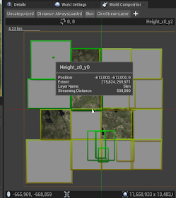 上の、「Uncategorized」「Distance-AlwaysLoaded」「5km」「CineStreamLayer」という表示はレベルが属するレイヤーを示します。用語がややこしいですが、アクターが属するレイヤーとは別物です。このレイヤーの役割は名前からわかりにくいですが同じStreaming Distanceを共有するサブレベルです。Uncategorizedはいわばデフォルトのレイヤーで、50,000(500メートル)まで近づくとロードされます。Distance-AlwaysLoadedは 2,147,483,647(2000万キロメートル)が設定されており、つまり常にロードされたままになります。一方、CineStreamLayerはStreaming Distance Disabledとされ、プレイヤーとの距離によるロードを無効化、つまり開発者が自分でロードするサブレベルということになります。
